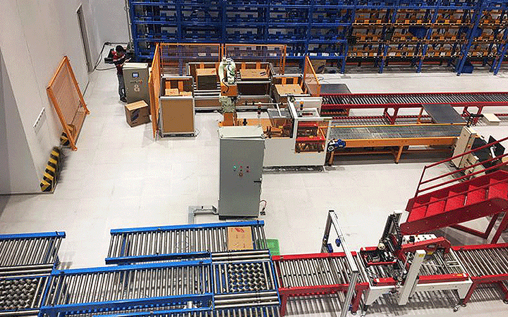 輸送裝置按貨物重量可分為重型和輕型兩種。重型輸送分揀線一般完成托盤類重型貨物的輸送,此類設(shè)備有重型滾筒機(jī)、鏈條機(jī)、頂升移載機(jī)、拆碼盤機(jī)、提升機(jī)、RGV、AGV等。輕型輸送分揀線主要用于輸送重量較輕的箱類、盒類貨物,在物流配送型的物 流系統(tǒng)中大量運用,主要有滾筒機(jī)、皮帶機(jī)、提升機(jī)、定時功能移載等。