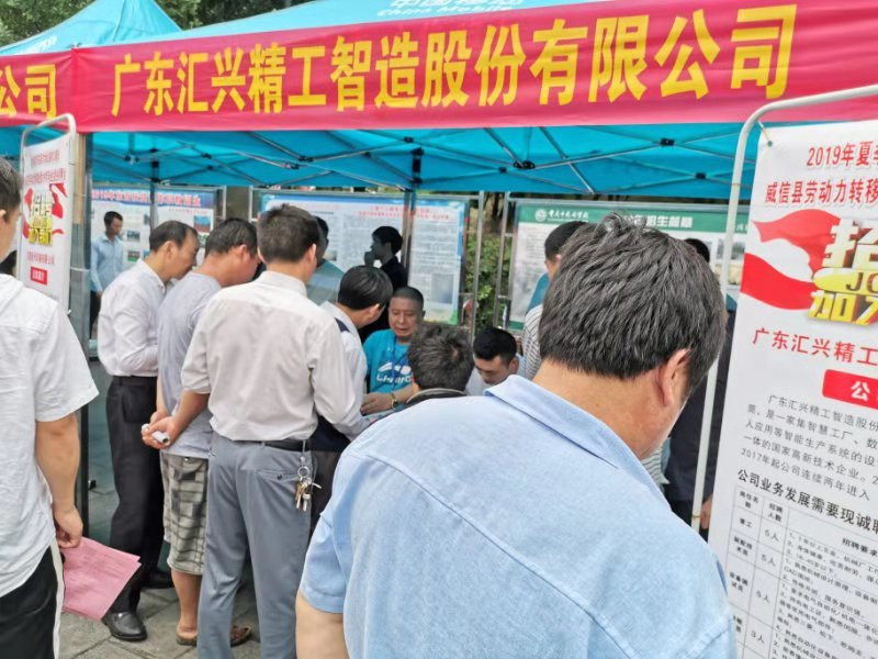 由威信縣委、縣政府,東莞市大嶺山鎮(zhèn)黨委、政府主辦,威信縣人社局、東莞市大嶺山鎮(zhèn)人社分局承辦的“2019年夏季東莞市大嶺山鎮(zhèn)對口幫扶威信縣農(nóng)村勞動力轉(zhuǎn)移就業(yè)專場招聘會”在云南威信縣體育館廣場隆重舉行。此次招聘會有來自廣東省大嶺山鎮(zhèn)的名優(yōu)企業(yè)10余家,大嶺山鎮(zhèn)提供就業(yè)崗位500余個。招聘會現(xiàn)場氣氛熱烈,其中匯興智造集團招聘位置前排成長長的隊伍,應聘者禮貌有序地排隊填寫應聘表。