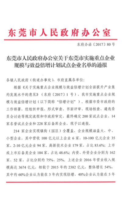 根據(jù)《關(guān)于實(shí)施重點(diǎn)企業(yè)規(guī)模與效益倍增計(jì)劃 全面提升產(chǎn)業(yè)集約發(fā)展水平的意見(jiàn)》(東府〔2017〕1號(hào)),以及《關(guān)于東莞市實(shí)施重點(diǎn)企業(yè)規(guī)模與效益倍增計(jì)劃試點(diǎn)企業(yè)名單的通報(bào)》(東府辦函〔2017〕80號(hào)),經(jīng)過(guò)前期的書面申報(bào)、形式審查、書面評(píng)審、現(xiàn)場(chǎng)核查、專家評(píng)審、材料審計(jì)等規(guī)定流程和市政府審定,廣東匯興精工智造股份有限公司(股票代碼:839258)憑借17年來(lái)在智能裝備領(lǐng)域的核心科技以及高成長(zhǎng)性,成功入選為東莞市實(shí)施重點(diǎn)企業(yè)規(guī)模與效益倍增計(jì)劃(以下簡(jiǎn)稱“倍增計(jì)劃”)200家試點(diǎn)企業(yè)之一。