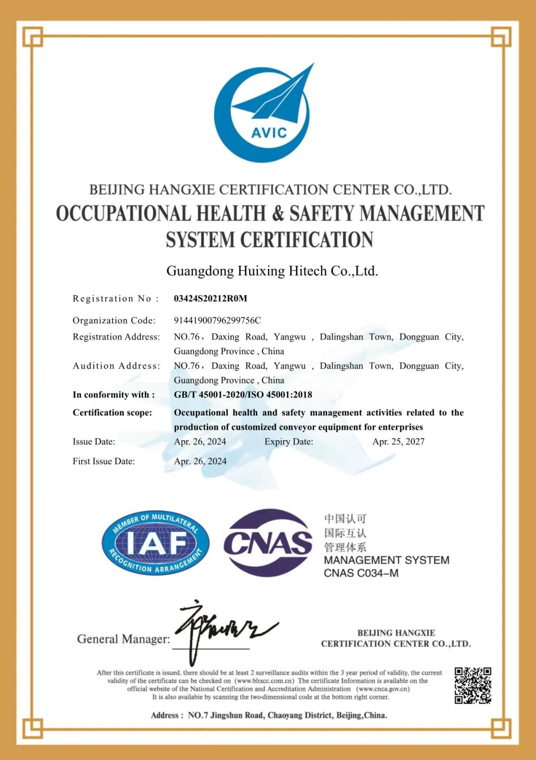 “做受尊敬好人,造受尊敬的產品,辦受尊敬的企業(yè),建受尊敬的平臺”是匯興智造的企業(yè)使命。4月7-9日,廣東匯興精工智造股份有限公司通過北京航協(xié)認證中心審核組進行為期3天的ISO14001環(huán)境管理體系和ISO45001職業(yè)健康安全管理體系認證,經過主管機構全面、嚴格、細致的審核,公司各項審核項目均已達到ISO14001環(huán)境管理體系和ISO45001職業(yè)健康安全管理體系標準要求,并于2024年4月26日正式獲得ISO14001環(huán)境管理體系和ISO45001職業(yè)健康安全管理體系認證證書。