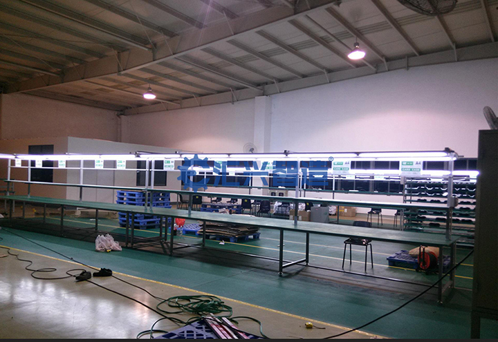 鏈板線采用A3板折制鏈板線專(zhuān)用軌道,而副導(dǎo)軌則采用角鐵制作。其中傳輸鏈條采用的是工業(yè)專(zhuān)用鏈板線鏈條;照明是采用單支帶罩T8LED日光燈,兩側(cè)連續(xù)安裝;工具吊軌采用專(zhuān)用風(fēng)批吊軌鋁材,兩側(cè)每米安裝一套風(fēng)批滑輪。此外,工藝看板采用專(zhuān)用雙杠H型鋁材做支架,每米配置一套亞克力板;采用6分鍍鋅制作而成的氣管和采用鍍鋅腳杯制作而成的地腳,共同為鏈板線的高效輸送保駕護(hù)航,能有力確保生產(chǎn)線的順利運(yùn)行。