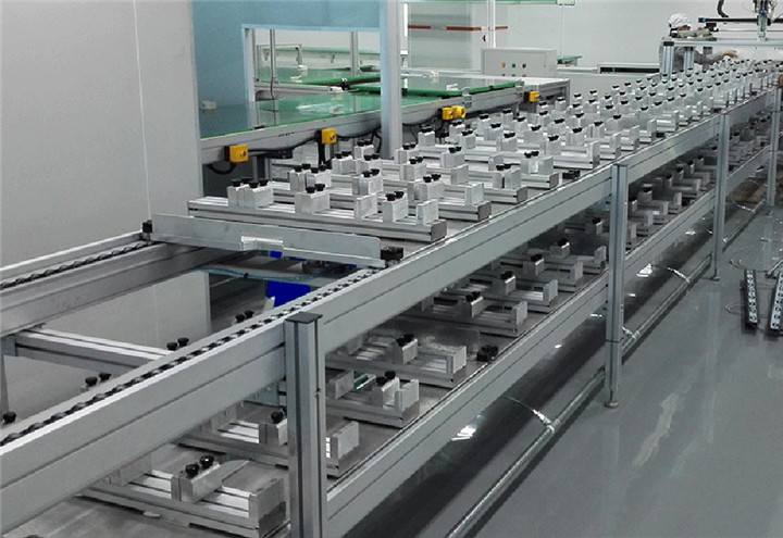 來料測試線機架腳架采用優(yōu)質(zhì)方通組焊制作,每2米一段,采用鍍鋅可調(diào)腳杯;線體皮帶護邊采用方管制作,沿線體兩側(cè)一路布置;承載采用鍍鋅滾筒,中心間距200㎜安裝一條,全線布置;輸送帶采用綠色PVC防靜電皮帶,厚2mm、寬500mm無縫熱縮接駁,皮帶面低于機身護邊8㎜;照明系統(tǒng):采用優(yōu)質(zhì)方管組焊制作,選用40W單支帶罩T8電子節(jié)能支架,全線布置。工作臺: 配對面坐工作臺,優(yōu)質(zhì)木夾板制作,面貼綠色防靜電膠皮,半圓木條包邊。