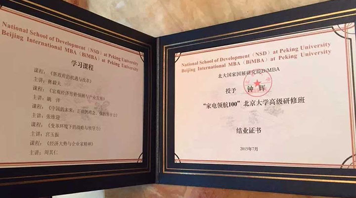 同時,經過一年的學習和相處,“家電領航100”北大班的同學們迎來了結業(yè)的日子。匯利興集團董事長鐘輝為此次畢業(yè)學員,中國慧聰家電城董事總經理宋冰晨先生為“家電領航100”北大班的同學們頒發(fā)結業(yè)證書。