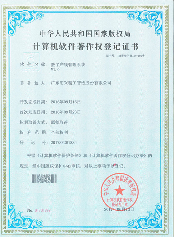 近日,匯興智造喜報頻傳,繼之前獲得多項發(fā)明專利和商標注冊之后,又參與國家標準的起草,如今再次獲得五項國家版權(quán)局計算機軟件著作權(quán)登記證書,它們分別是產(chǎn)品數(shù)字化追溯系統(tǒng)、車間生產(chǎn)工藝參數(shù)監(jiān)控系統(tǒng)、車間生產(chǎn)設備維護管理系統(tǒng)、生產(chǎn)績效考核管理系統(tǒng)和數(shù)字產(chǎn)線管理系統(tǒng)這五大軟件。匯興智造17年來,精工制造各類智能自動化生產(chǎn)線,擁有行業(yè)深厚的經(jīng)驗,在充分了解客戶的實際需求后,開發(fā)了產(chǎn)品數(shù)字化追溯系統(tǒng)等軟件,并取得相關(guān)著作權(quán)。其中,權(quán)利取得方式為原始取得,權(quán)利范圍為全部權(quán)利。