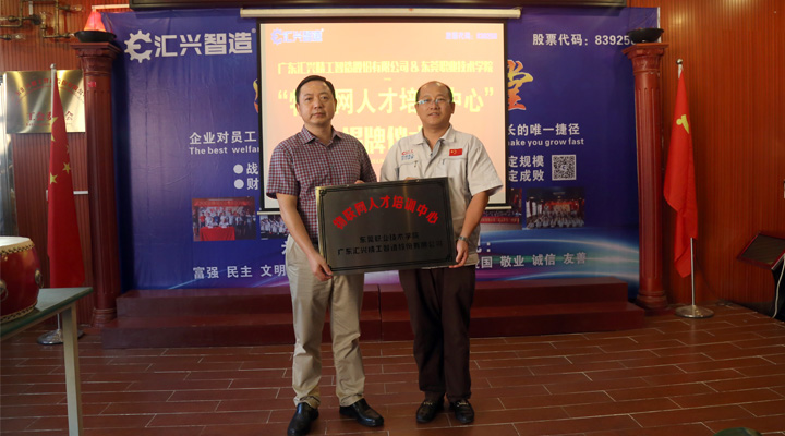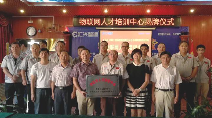 2017年9月27日下午, 東莞職業(yè)技術(shù)學(xué)院副院長楊云奇,計(jì)算機(jī)工程系主任胡選子博士,藝術(shù)設(shè)計(jì)系主任何鳳梅博士,計(jì)算機(jī)系曹文梁教授等專家人員一行蒞臨廣東匯興精工智造股份有限公司(股票代碼:839258)考察調(diào)研并舉行“物聯(lián)網(wǎng)人才培訓(xùn)中心“基地揭牌儀式。匯興智造董事長鐘輝,匯興中德智能制造研究院院長李康順教授熱情接待了調(diào)研組一行。